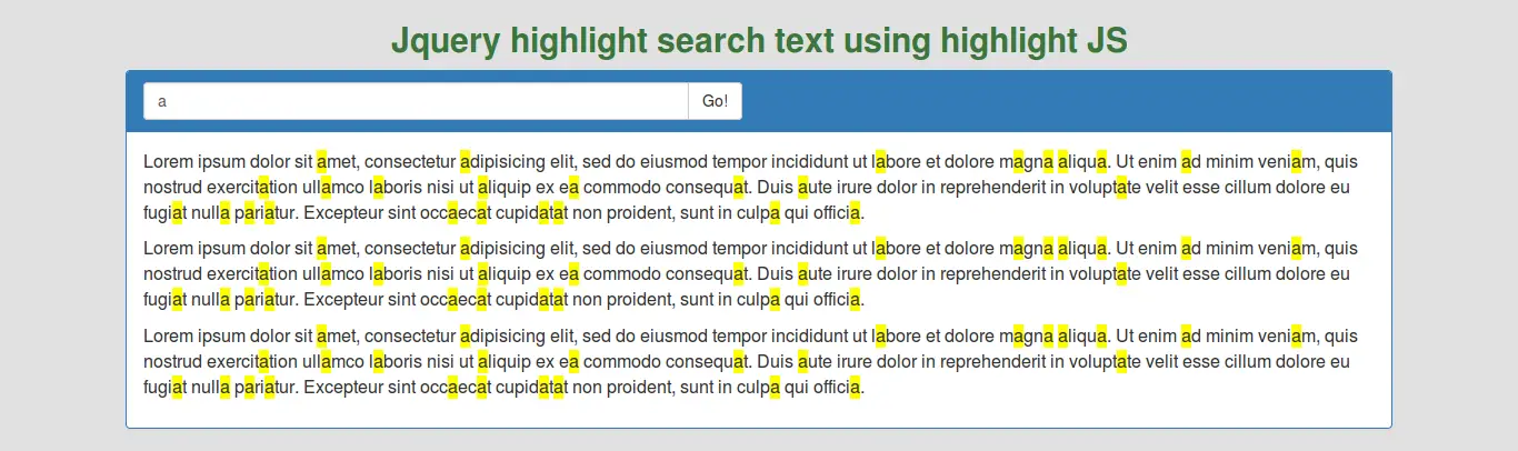 I am going to show you an example of jquery highlight search text in div. if you want to see an example of jquery highlight text input then you are in the right place. We will look at an example of jquery highlight text search on page example. you can understand a concept of highlight words on search html jquery.