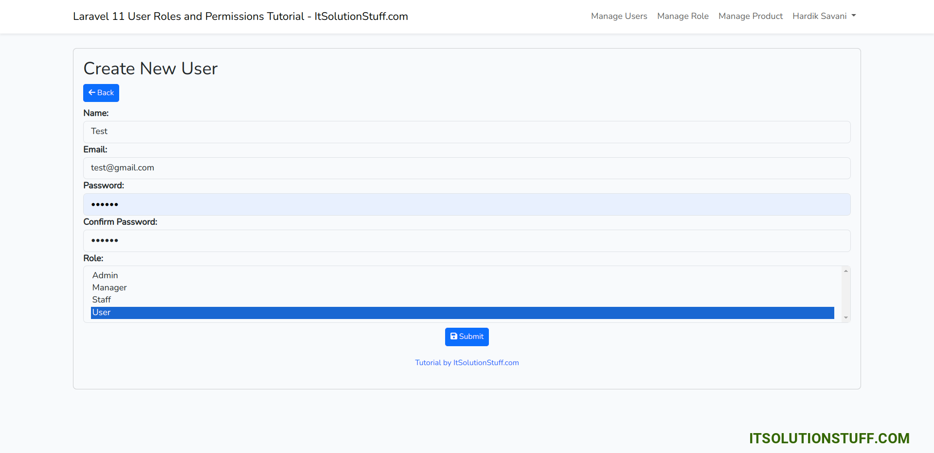 After registering a user, you won't have any roles. So, you can edit your details and assign the admin role to yourself from User Management. After that, you can create your own role with permissions like role-list, role-create, role-edit, role-delete, product-list, product-create, product-edit, product-delete. You can test this by assigning a new user and checking it.