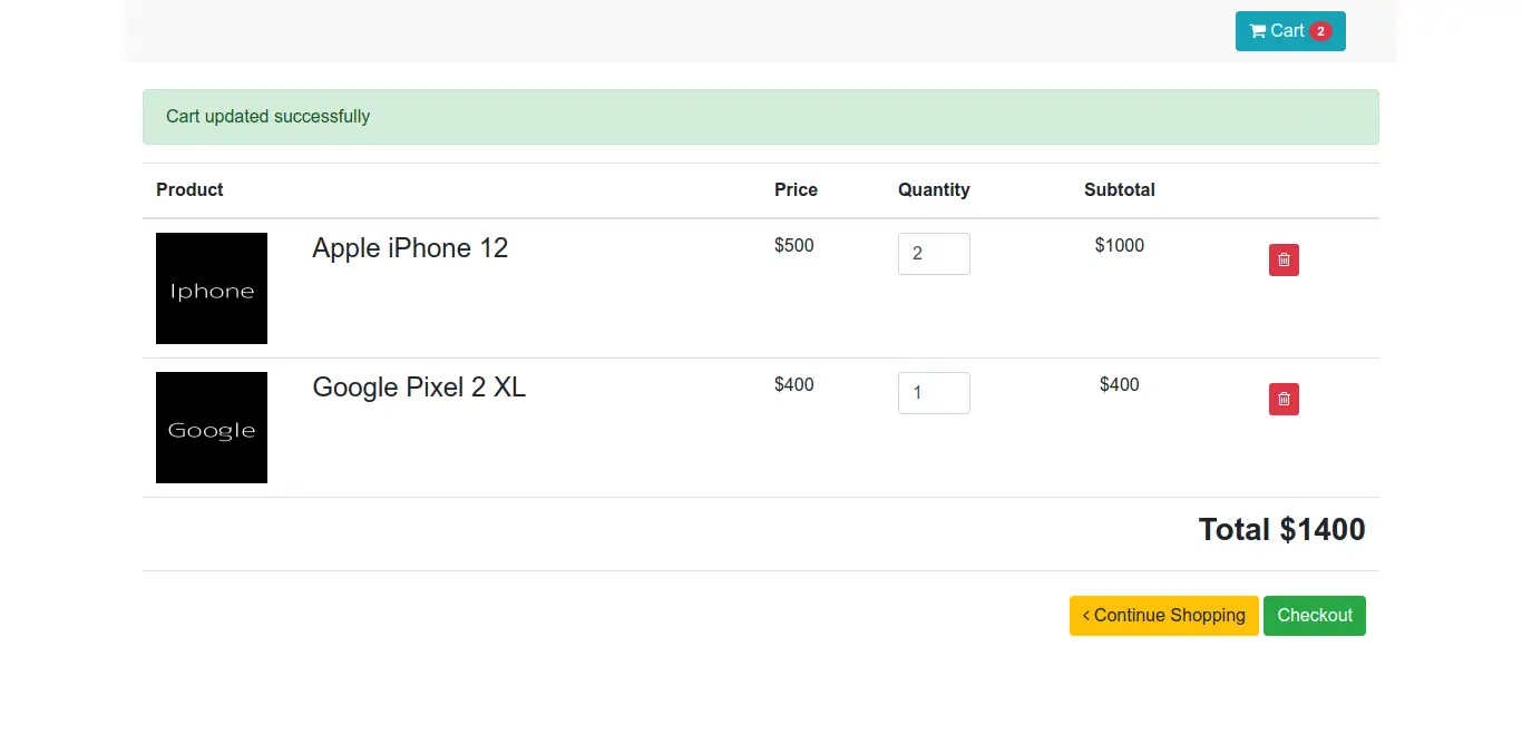 in this example, i will create products table and display in list. you can add to cart that product. also created cart page where you can change product quality and remove product from there, so let's see bellow image follow bellow step.